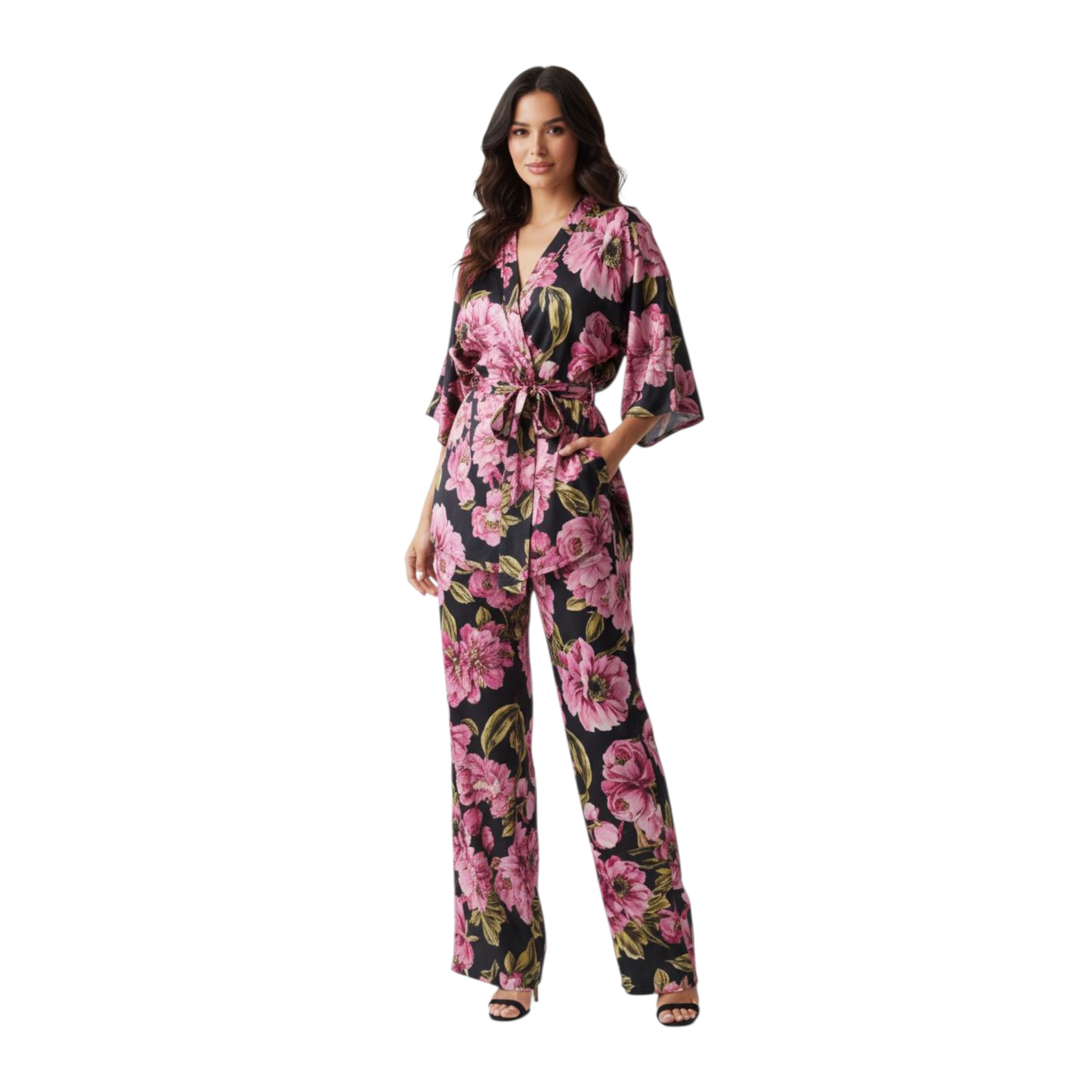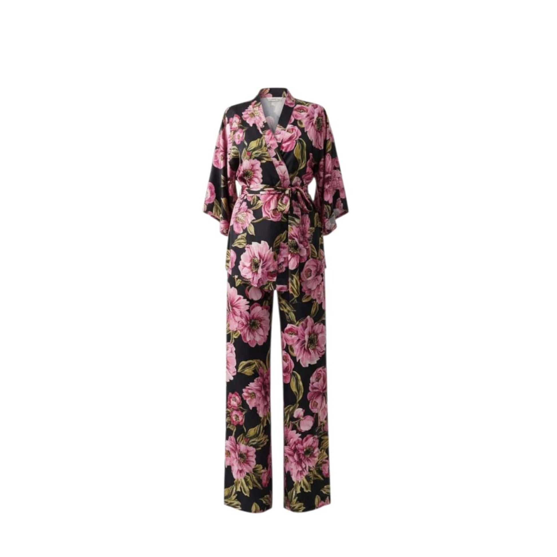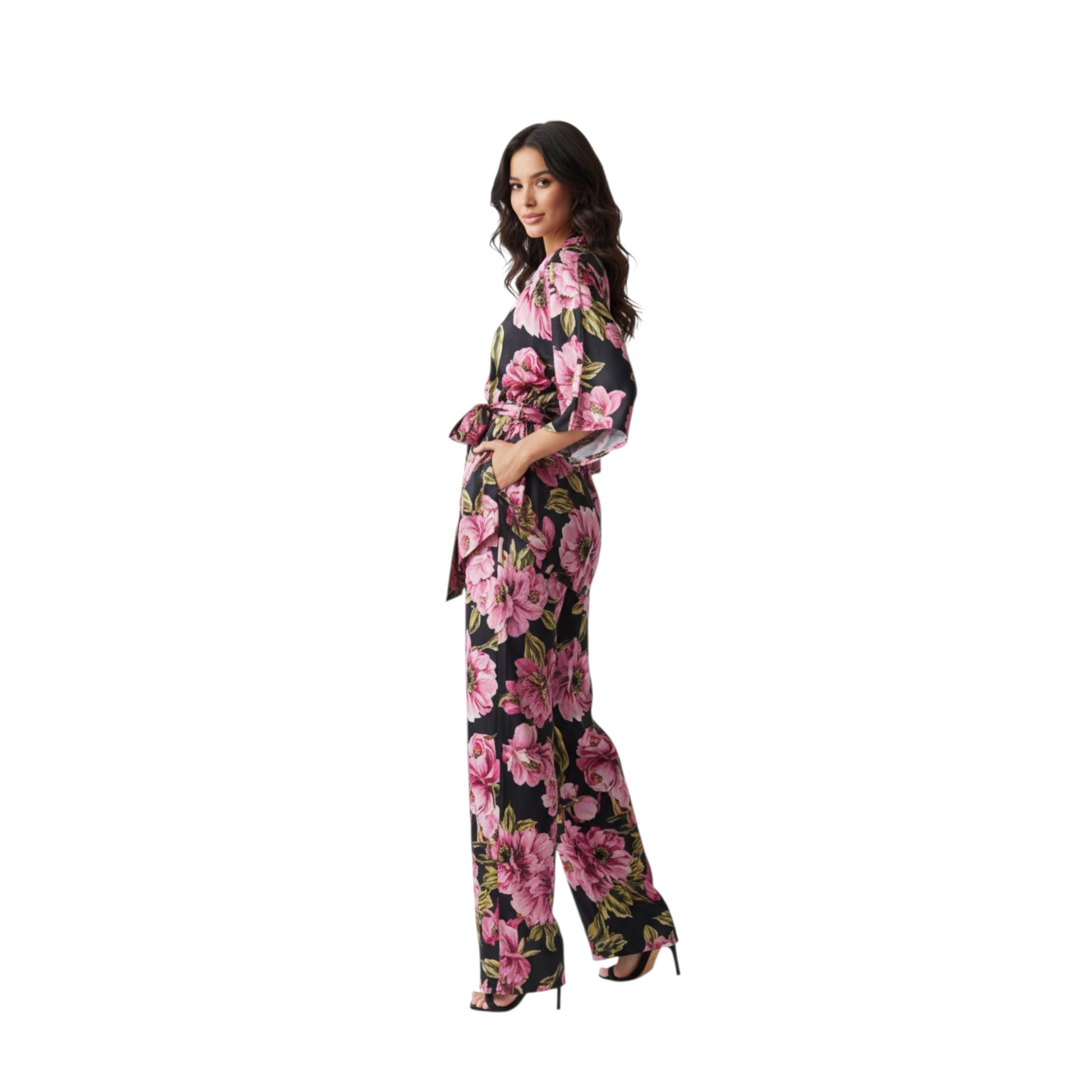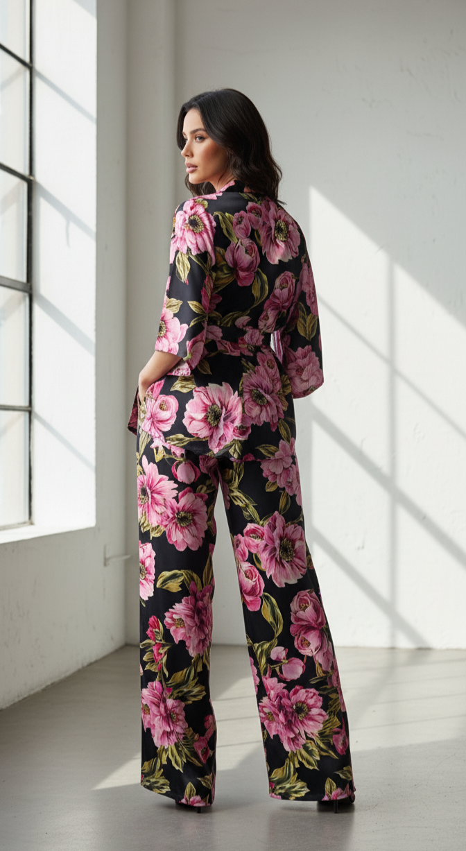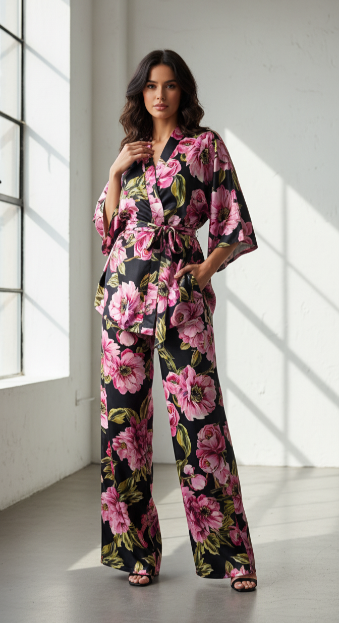 Blossom Breeze silk outfit is a striking two-piece ensemble featuring a kimono-style top and matching wide-leg trousers. The fabric is adorned with a vibrant floral pattern, showcasing bold shades of pink against a dark black background, creating a stunning contrast. The top features a wrap design with a belted waist, enhancing the silhouette and providing a flattering fit. The wide-leg trousers offer comfort and a relaxed fit, making the outfit suitable for both casual outings and comfortable days at home. This set effortlessly combines elegance and ease, perfect for any fashion-forward occasion.
