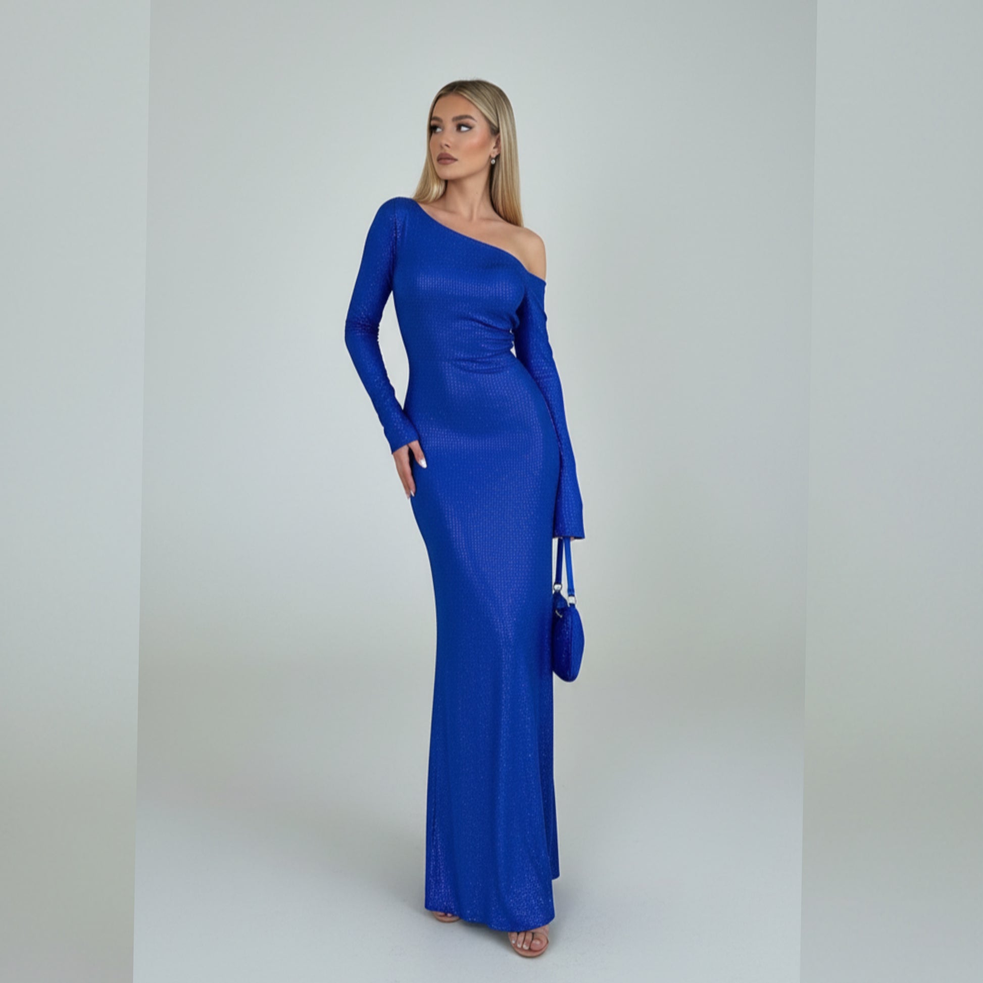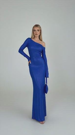 This stunning Swarovski Crystal Embellished Maxi Gown features a sleek, floor-length silhouette in a vibrant royal blue. The dress boasts a sophisticated off-the-shoulder neckline on one side, balancing a long, elegant sleeve with a bare shoulder on the other. Its entire surface appears to be meticulously adorned with shimmering Swarovski crystals, creating a dazzling, all-over sparkle that catches the light beautifully. The fabric drapes elegantly, accentuating the figure. The model carries a matching blue mini-handbag, completing a look of pure glamour and luxury, perfect for a red carpet event or an exclusive evening affair.