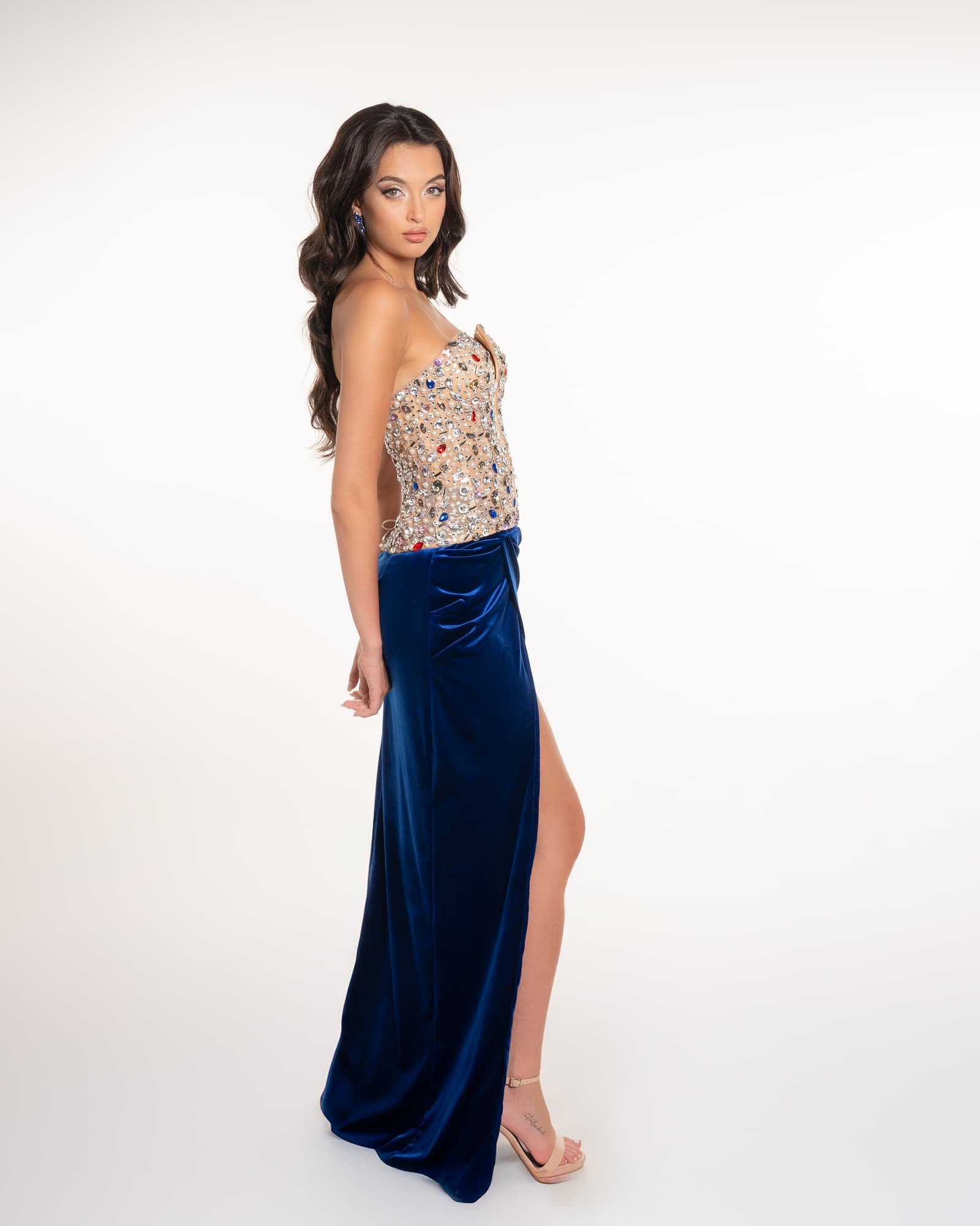 PRE-ORDER Blue moon stunning set features a beautifully crafted bodice adorned with intricate embellishments,including colorful gems,that contrasts elegantly with a rich velvet skirt .The gown boast a daring plunging neckline,enhancing its allure,while the skirt is designed with a sophisticated draping effect,revealing a high slit on one side.The deep blue hue of the dress adds a touch of elegance,making it perfect for formal occasions or evening events.Pair it with chic accessories for a complate look The model is 176cm and is wearing the dress in size S This item is on pre-order This item will be specially made for you when we receive your order . Please note that the production time is 30-60 days ,exluding shipping If you have an urgent deadline or would like to customise the colour or length of this piece,please do not hestitate to contact us. Please bear in mind that our customisation fee is €150 and modifications are limited to colour and length only. We are unable to fulfil any other customisation requests at this time. Our team is committed to providing you the best experience, and in return we trust that you can understand that any garments that have been customised cannot be refunded for store credit or exchanged. Care Recommended professional cleaning Ironing :If necessary,use a low heat setting or place a cloth between the iron and the fabric to prevent direct contact