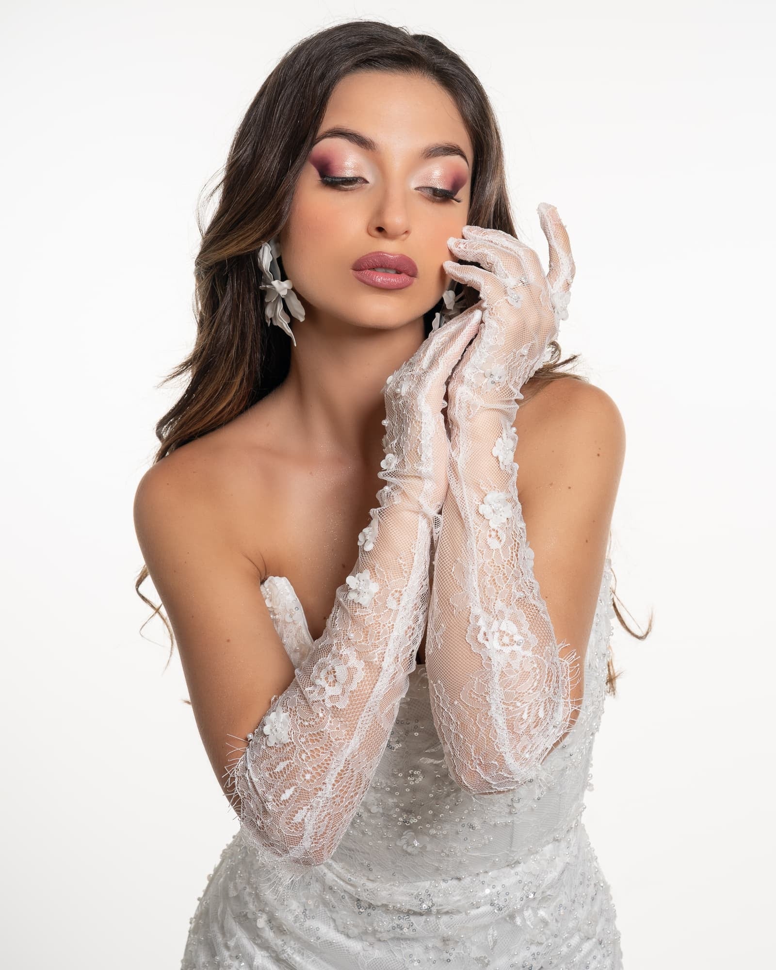 PRE-ORDER Madeline's Moments is a stunning white mini dress featuring a fitted silhouette,flattering the figure while providing comfort with boning support throughout the bodice .The scoop neck cut adds a classic and feminine touch ,offering a delicate frame for the collarbone .Crafted from a luxurious lace overlay,the dress is adorned with intricate beadwork that glimmers under light,enhancing its sophistication.The short length of the dress gives it a playful yet chic vibe ,perfect for special occasions.Paired with sheer lace gloves that extend to the elbow,the entire ensemble exudes an air of elegance .Complite the look with high-heeled sandals ,adding to its refined aesthetic. This dress is ideal for a rehearsal dinner or any festive celebration,offering a blend of modern style and timeless charm .