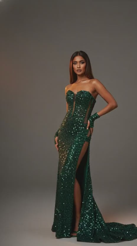 This stunning maxi dress features a figure-hugging corset design adored with shimmering green sequins.The strapless silhouette accentuates the wearer's curves,while strategically placed cut-outs add element of allure.The gown boasts a side slit for a dramatic effect,offering both elegance and a hint of seduction.Complementing the ensemble,matching gloves enhance the overall sophistication of the look,making it perfect for glamorous events or red-carpet occasions