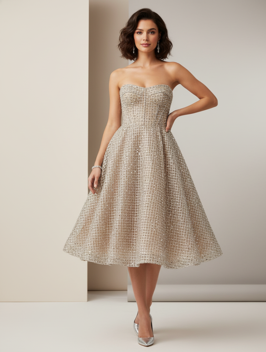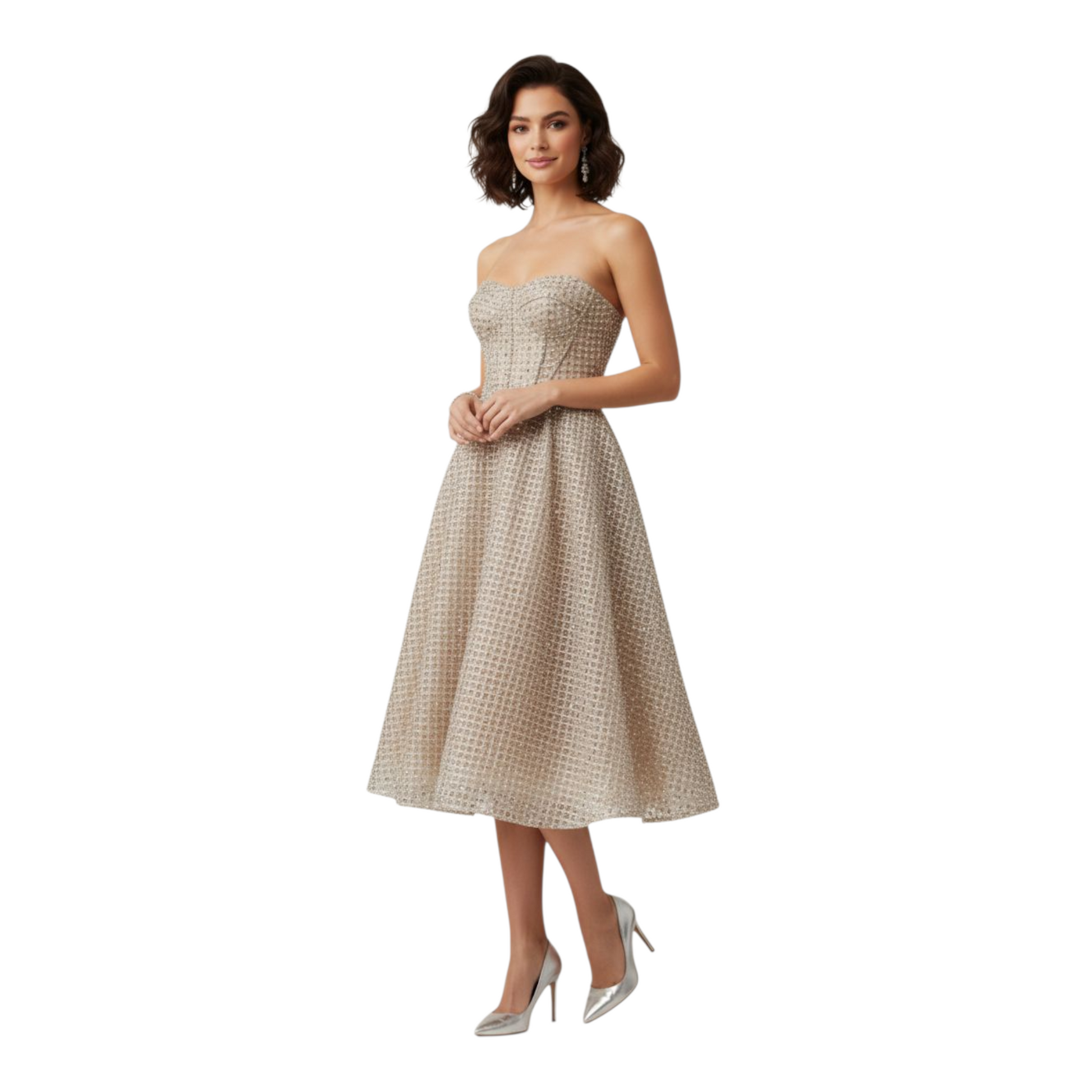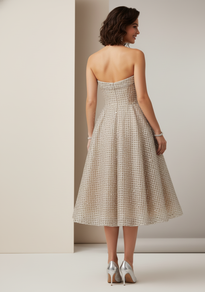 This dress features a strapless design with a fitted bodice that elegantly accentuates the waist. The skirt flows into a classic midi length, creating a timeless silhouette. The fabric has a textured, grid-like pattern that adds visual interest, while the neutral tone gives it a versatile and chic look. Paired with heels, this dress is perfect for formal events or special occasions.