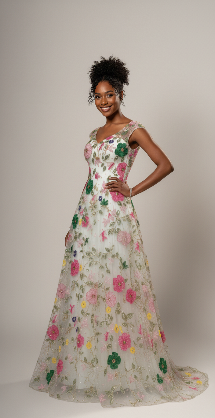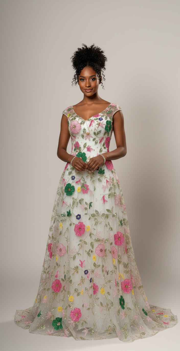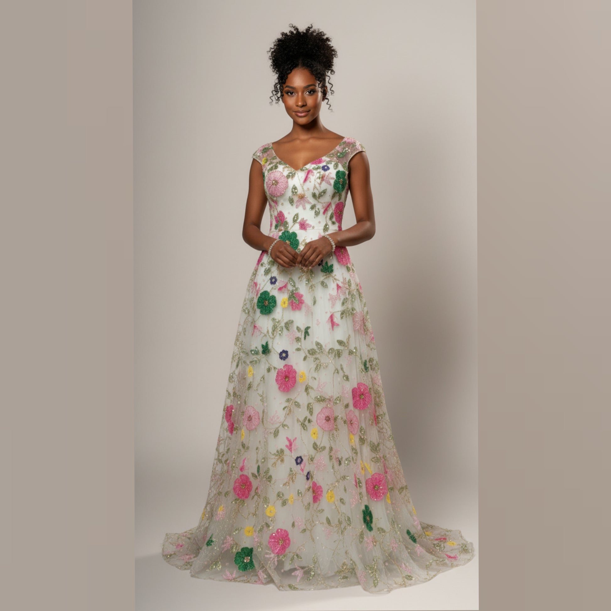The floral dress is a beautiful gown with a white base adorned with vibrant, colorful embroidered flowers in shades of pink, green, yellow, and blue. The flowers are embellished with small beads giving them a subtle shimmer. The dress features a V-neckline with cap sleeves and a fitted bodice that flares out into a full, A-line skirt with a slight train, creating a flowing and elegant silhouette