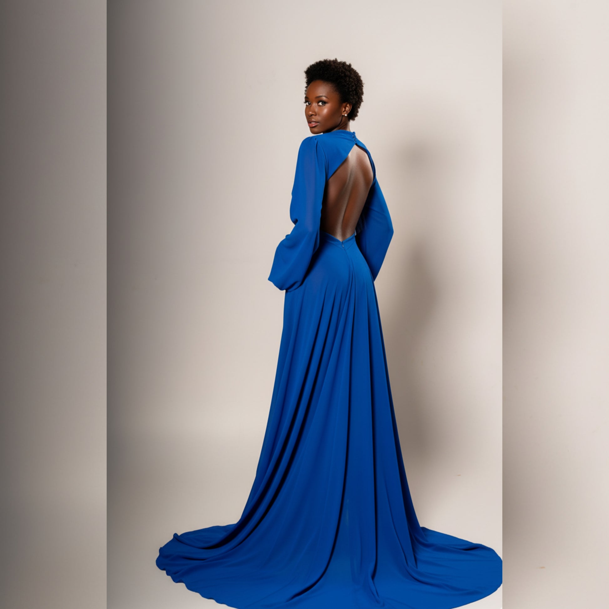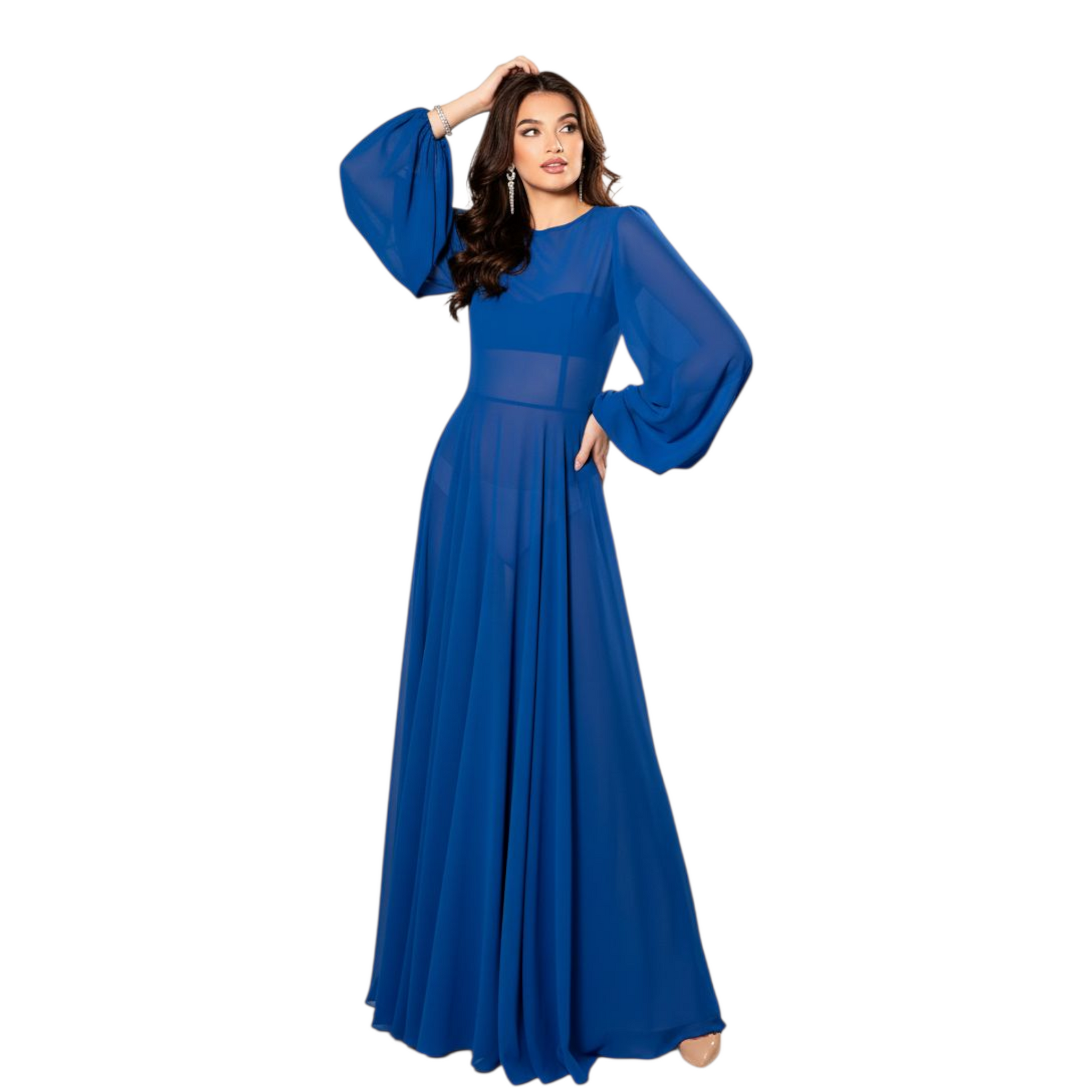 This stunning semitransparent dress is crafted from luxurious chiffon crepe ,offering a perfect blend of elegance and comfort .It features a flowing maxi length that gracefully trails behind,enhancing your silhouette.The long sleeves add a touch of sophistication,while the open back design adds an element of allure ,making it ideal for special occasions .The transparent accents create a beautiful contrast ,making this dress not only chic but also effortless stylish .Perfect for evening events or formal gatherings,this dress is sure to turn heads wherever you go .
