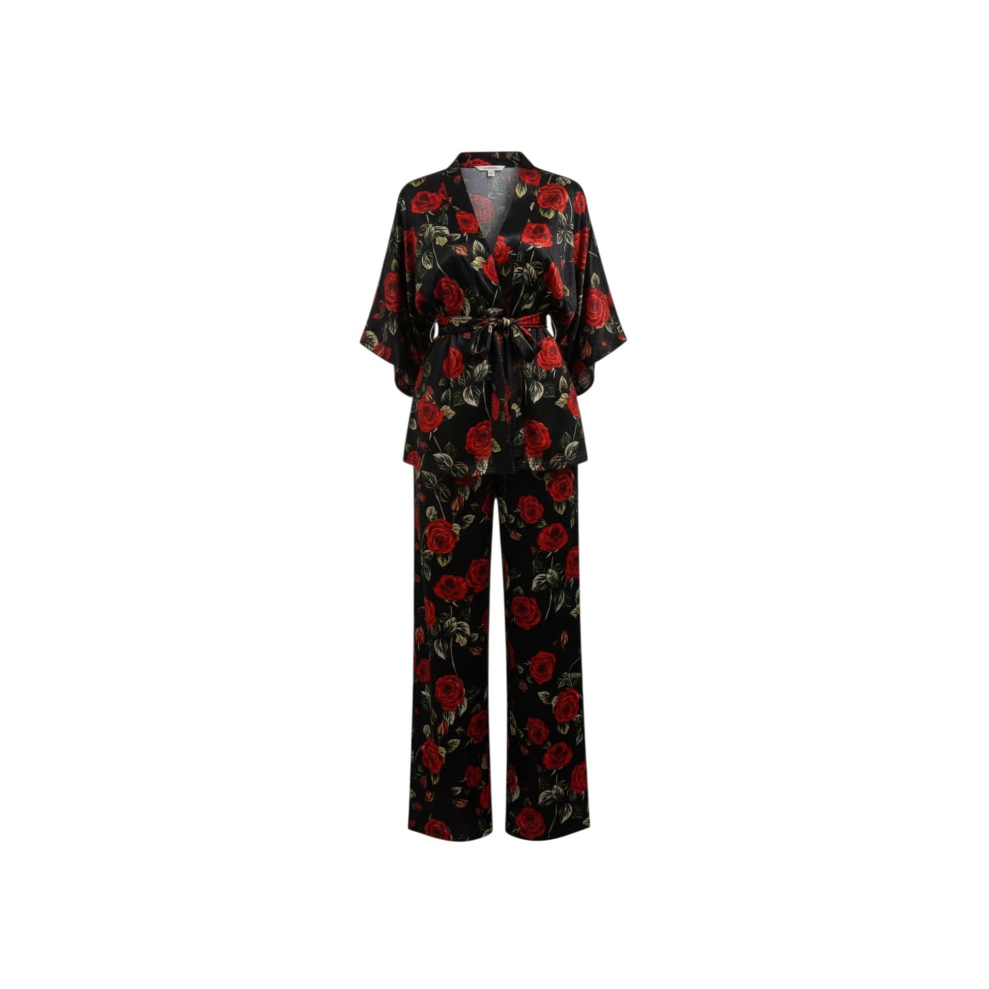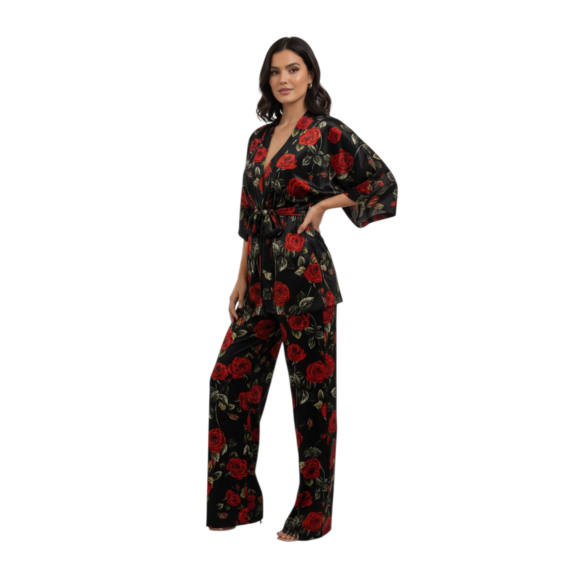 Midnight Rose silk is a relaxed and elegant design, characterized by a black fabric adorned with vibrant red roses and green leaves. It consists of a long-sleeved, kimono-style top that has a flattering deep V-neckline. The waist is cinched with a matching tie belt, creating a defined silhouette. The pants are wide-legged and flowy, mirroring the floral pattern of the top, making it a stylish and comfortable choice for both lounging and casual outings. The overall aesthetic is both chic and romantic, perfect for a laid-back yet fashionable look.