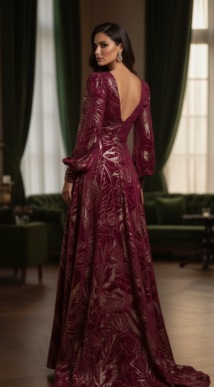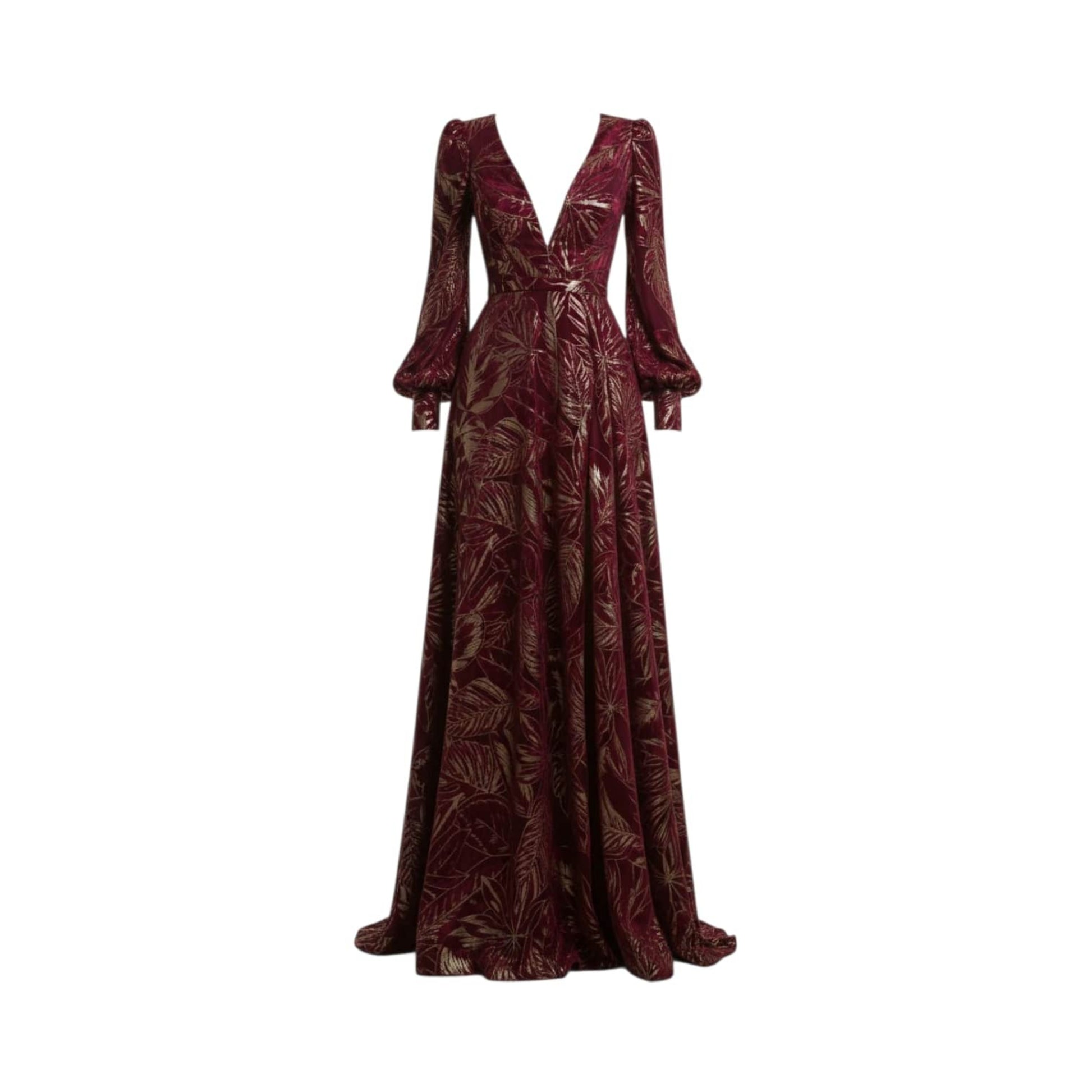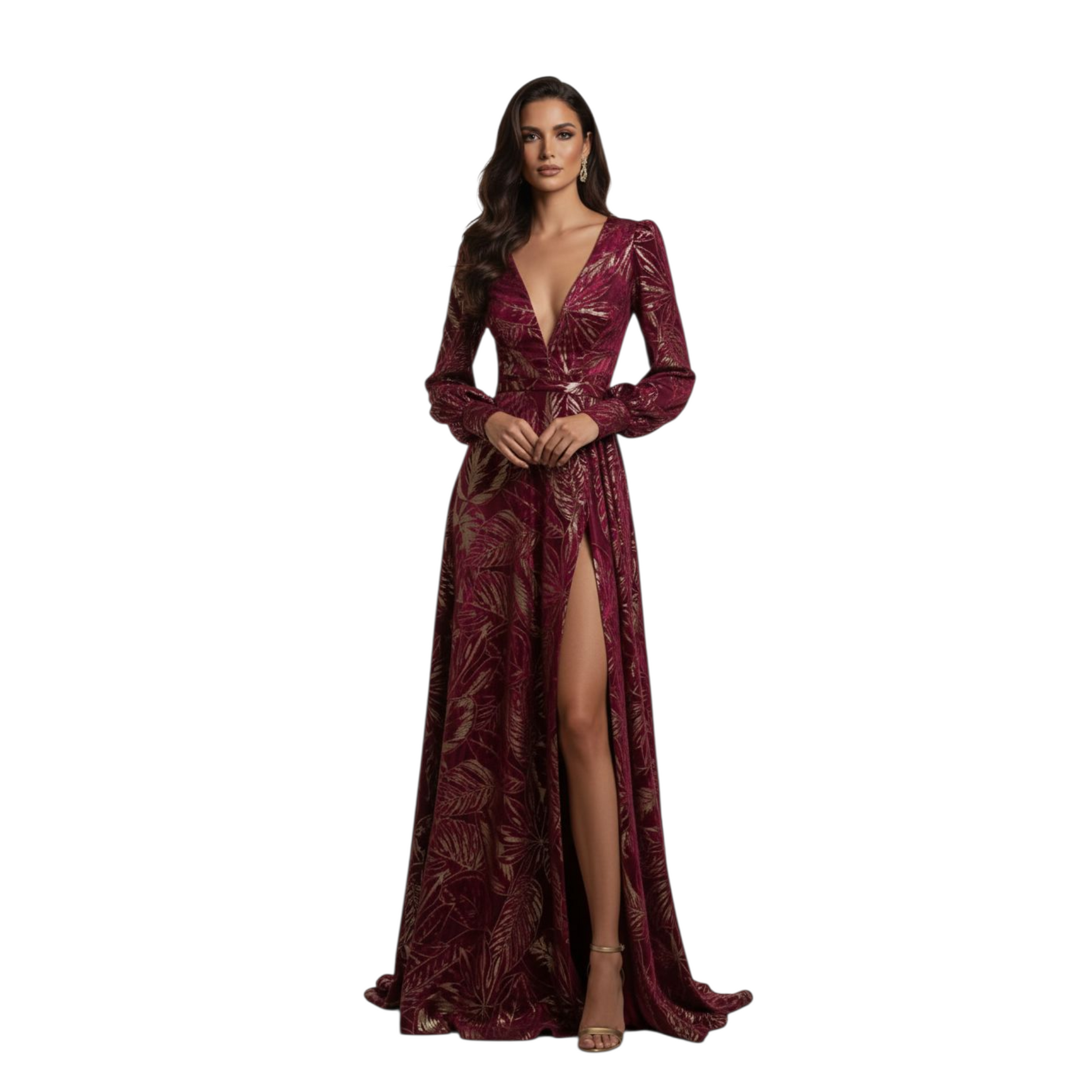 This velvet silk davorè dress features a stunning deep V-neckline and long, elegant puff sleeves. The rich burgundy color is beautifully complemented by an intricate leaf pattern that shimmers subtly, creating a striking visual effect. The dress is designed to hug the waist and flows into a dramatic skirt with a thigh-high slit, adding an element of allure and sophistication. The luxurious fabric drapes gracefully, making it perfect for formal occasions or evening events. The overall silhouette is both flattering and eye-catching, embodying a blend of elegance and modern femininity.