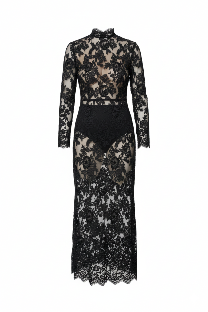 Deborah stunning lace dress features intricate floral patterns that exude elegance and sophistication.With a fitted silhouette and a mid-length style,it showcases a chic ,contemporary design.The high neckline and long sleeves add a touch of modesty,while the sheer lace fabric provides a hint of allure.Perfect for formal occasions or evening events,this dress pairs beautifully with stylish heels for a complate look.