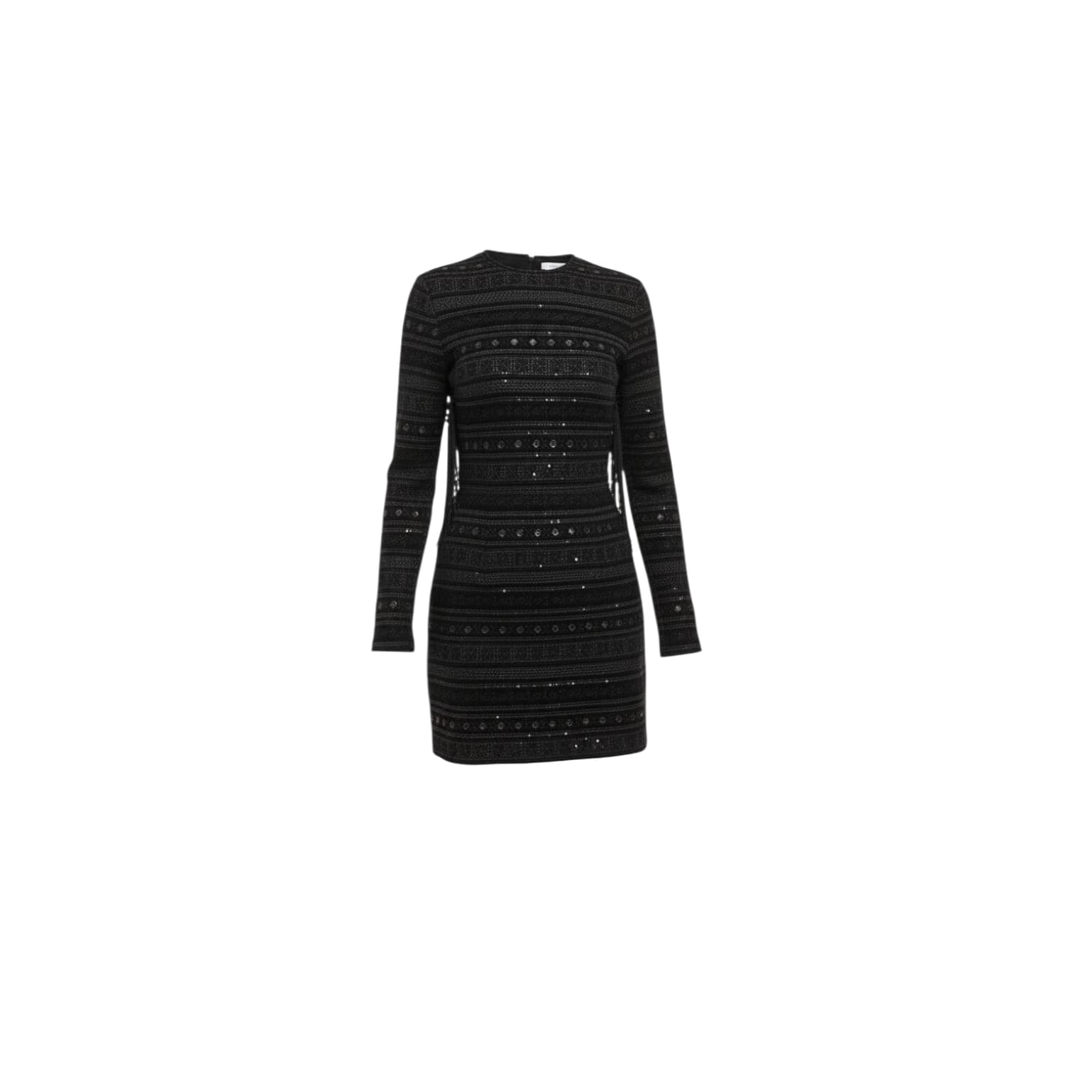 This elegant velvet dress is ideal for a festive holiday gathering. It showcases a round velvet neckline, a mini length, and a triangular open back adorned with a fringe. Elevate your next occasion with this opulent and attention-grabbing design.