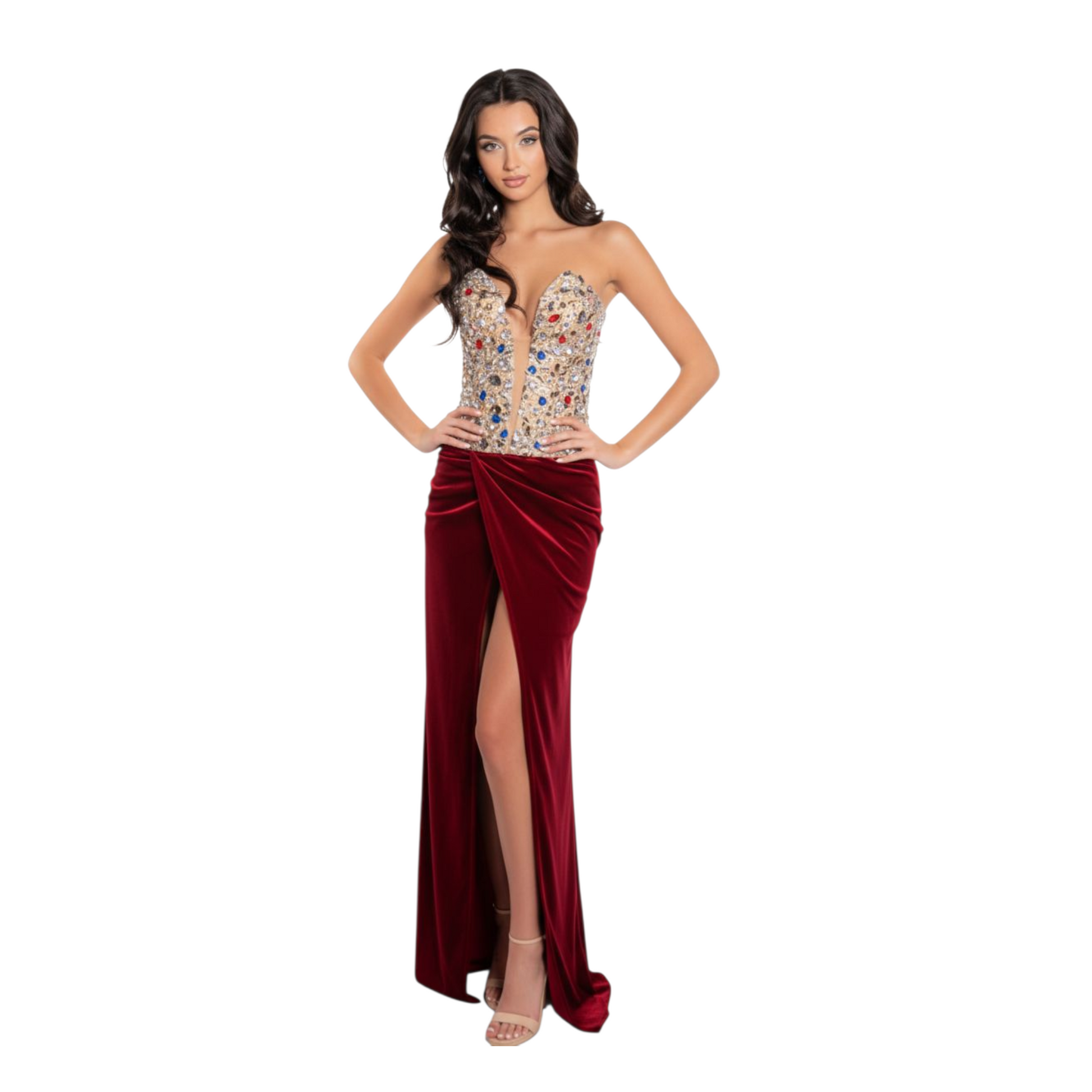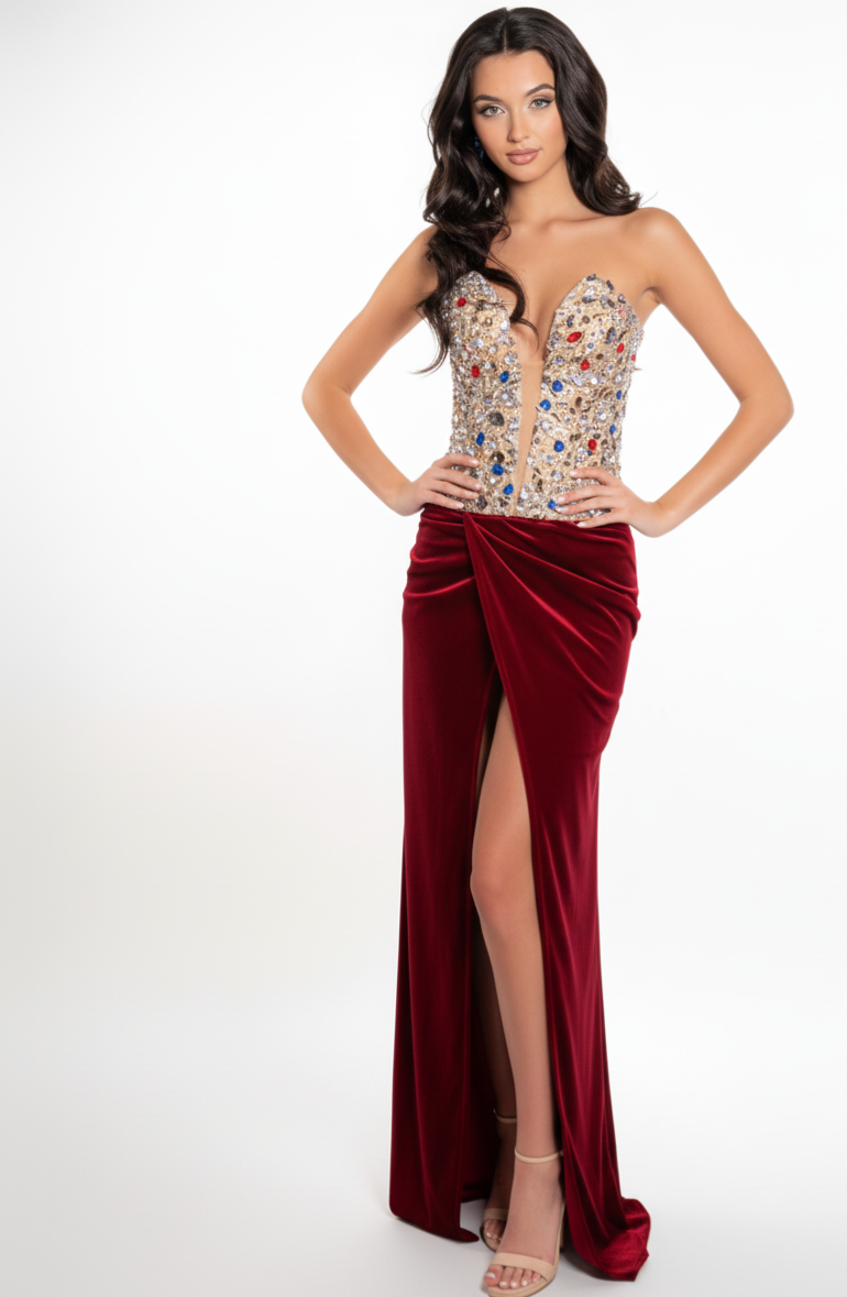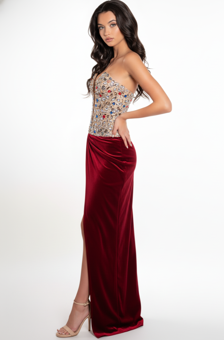 Vespera /"evening star " gown features a strapless bodice adorned with intricate embellishments, including jewels and sequins in a variety of colors, set against a nude-toned base. The deep sweetheart neckline adds a touch of allure. The skirt is a rich, deep red velvet, designed with a high slit that reveals one leg, and is draped in a sophisticated wrap style around the waist. The overall silhouette is long and flowing, exuding glamour and sophistication.