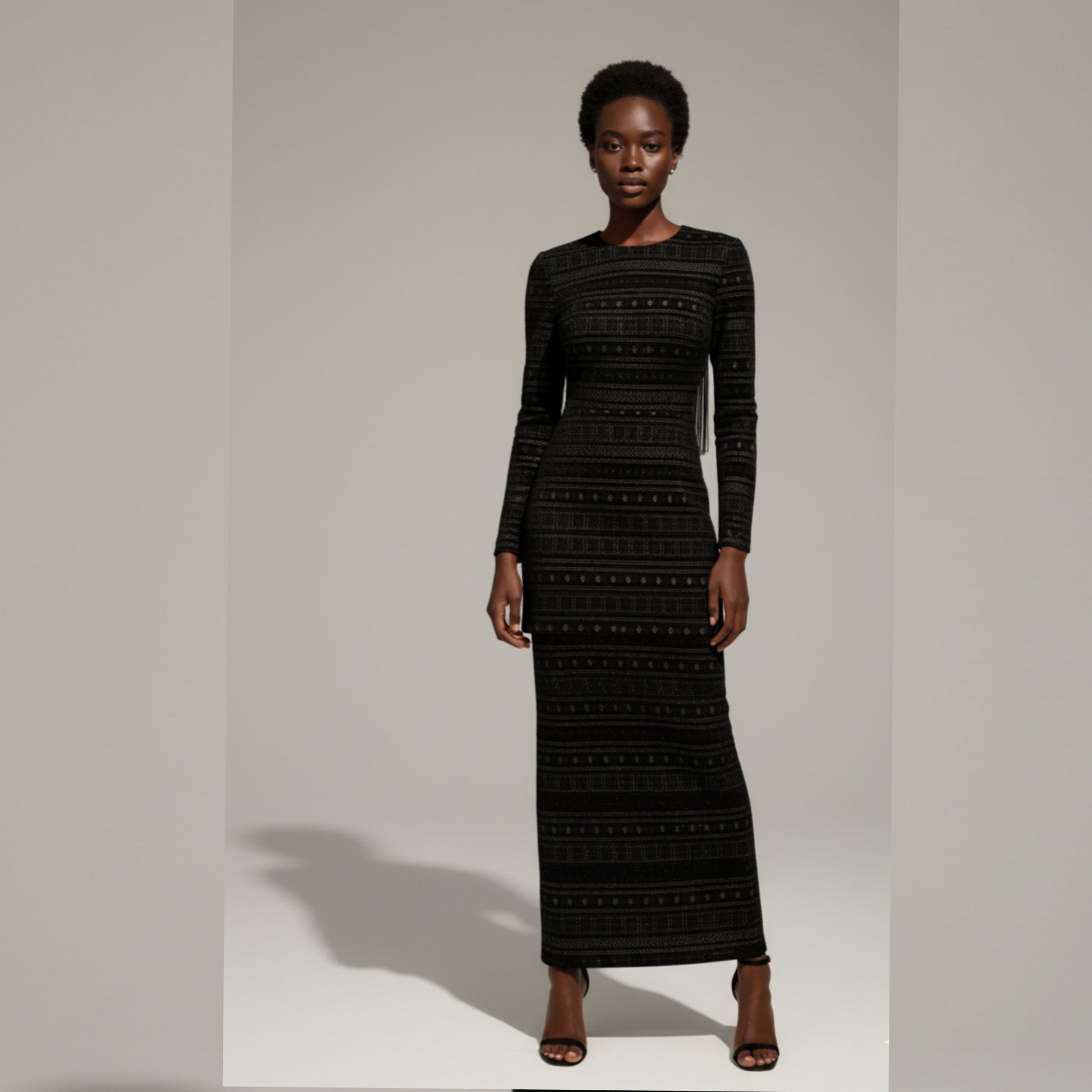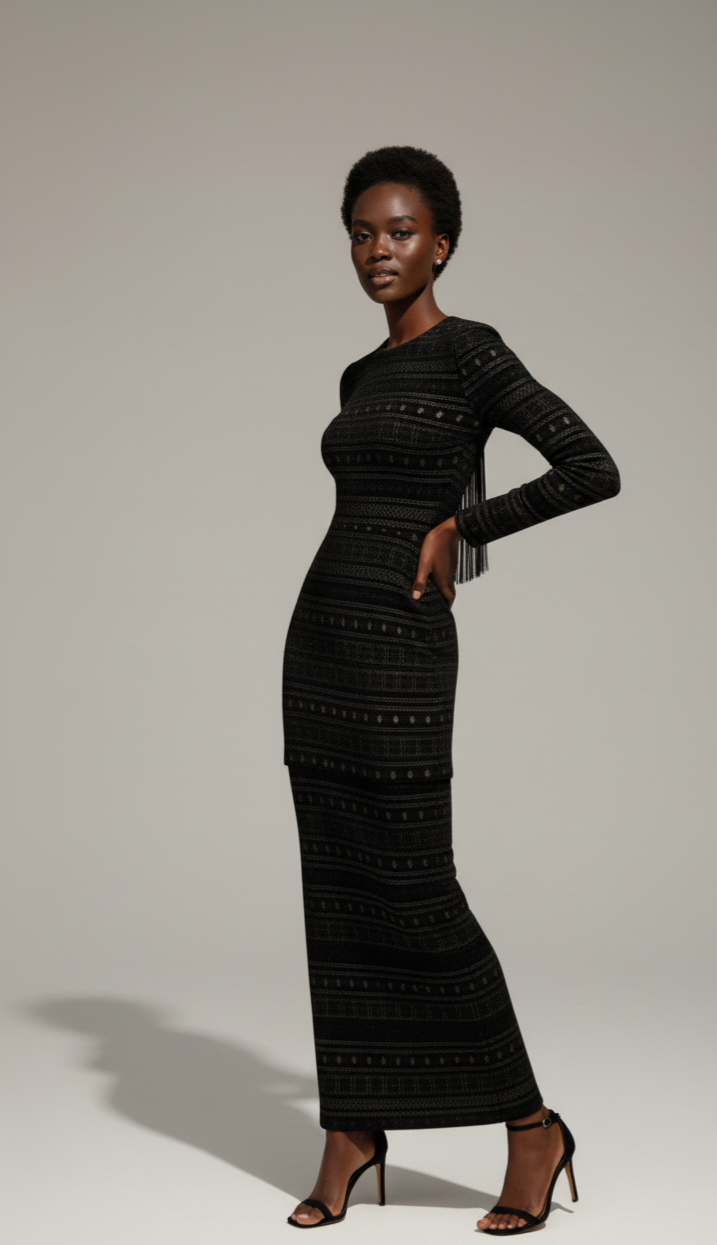 This elegant velvet dress is ideal for a festive holiday gathering. It showcases a round velvet neckline, a maxi length, and a triangular open back adorned with a fringe. Elevate your next occasion with this opulent and attention-grabbing design.
